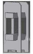 框架主視圖,三維構(gòu)型如圖1所示。左、右框板是支撐承力構(gòu)件,上、下壓板是主要的傳力構(gòu)件,將液壓缸的壓力傳導(dǎo)到中間工作板上。上壓板固定在左右框板內(nèi)孔的上沿,下壓板固定在液壓缸柱塞上并隨柱塞上下運動。