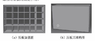 初始設(shè)計時,上、下壓板采用實心平板結(jié)構(gòu),強(qiáng)度計算時發(fā)現(xiàn)其交形較大,剛度不足。如果單純增加甲板厚度以增加其剛度,重量、成本等因素將不符合設(shè)計要求,因此,優(yōu)化設(shè)計中采用框架式壓板,如圖2所示,不僅提高了壓板的剛度,還碗輕了壓板結(jié)構(gòu)重量,降低了生產(chǎn)成本。