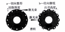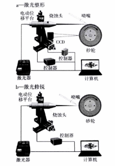 修整水磨片時,激光束通常有切向和徑向兩種入射方式,如圖1所示。圖2為激光修整實驗裝置示意圖。表1為修整實驗參數(shù)。脈沖光纖激光束由單模光纖傳輸至固定在電動平移臺上的燒蝕頭內(nèi)部,再經(jīng)準(zhǔn)直、聚焦后入射至安裝在平面磨床主軸上的水磨片表面(整形時激光束沿水磨片表面切線方向入射,修銳時激光束沿水磨片表面法線方向入射)。固定在電動平移臺上用于檢測水磨片表面圓跳動和平行度誤差的CCD激光位移傳感器(LK-G80)與燒蝕頭保持同步運動。