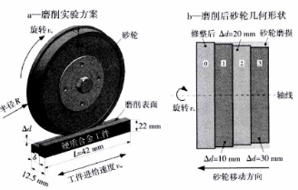 用修整后的同一片水磨片以逆磨方式磨削3塊硬質(zhì)合金工件,實驗參數(shù):水磨片線速度為20m/s,工件進給速度為2.5mm/s,磨削深度為100m,累計磨削深度為30mm,磨削液流量為40L/min。方案如圖3所示。