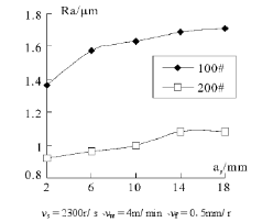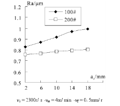 對比圖1、圖2可以看出,不同的磨削條件對工件的表面粗糙度影響很大,這是由于用樹脂結(jié)合劑平行金剛石樹脂軟磨片磨削陶瓷工件時,磨削區(qū)溫度很高,在干磨削時(見圖1),兩種樹脂軟磨片對應(yīng)的加工工件表面粗糙度值差距很大,然而在有磨削液條件下磨削時(見圖2),兩種樹脂軟磨片對應(yīng)的加工工件表面粗糙度值的差距明顯縮小,由此可以得出結(jié)論:冷卻液能夠提高磨削表面質(zhì)量,尤其是使用大顆粒磨粒樹脂軟磨片磨削時,冷卻液的作用更為明顯。由于陶瓷的磨屑是不連續(xù)的粉狀,若沒有磨削液的清洗,磨屑易堵塞樹脂軟磨片表面使樹脂軟磨片鈍化,影響磨削效果;此外,若沒有磨削液的冷卻,樹脂結(jié)合劑會因高溫?zé)苟撀�,影響樹脂軟磨片磨削效果,進(jìn)而影響陶瓷工件表面質(zhì)量。由此可見,是否使用磨削液對陶瓷磨削加工有著很大影響,要想獲得良好的表面質(zhì)量,陶瓷磨削加工必須在有磨削液的條件下進(jìn)行。