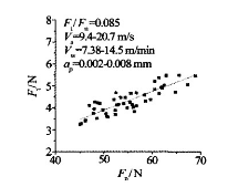 對(duì)加工條件范圍內(nèi)(V.為9.4~ 20.7 m/s,V。為7.38-14.5 m/min,a.為2-8 μm)的48個(gè)法向力和48個(gè)切向力數(shù)據(jù)點(diǎn)進(jìn)行擬合。擬合結(jié)果如圖1。