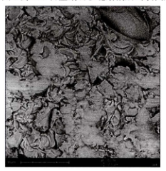 圖1所示為270目樹(shù)脂結(jié)合劑金剛石軟磨片磨削火成巖質(zhì)水晶力比回歸圖。由圖2可以發(fā)現(xiàn),在所有加工條件下,磨削力比F/F。為0.085,比粗磨時(shí)用120目電鍍金剛石軟磨片磨削的力比0.26要小5。力比小于1是因?yàn)榍邢蛄^小(3.25~5.49 N) ,而法向力較大(45-68.9 N)。切向力僅僅起到掃除碎屑的作用,而法向力使工件表面層以下產(chǎn)生橫向裂紋,材料破碎。法向力越大則破碎越容易形成。用270目樹(shù)脂結(jié)合劑金剛石軟磨片和文獻(xiàn)[4]用120目電鍍金剛石軟磨片磨削火成巖質(zhì)水晶時(shí),切向力差別不大,而法向力差別較大。270目樹(shù)脂結(jié)合劑金剛石軟磨片磨削火成巖質(zhì)水晶時(shí),法向磨削力為45-68.9 N;120目電鍍金剛石軟磨片磨削火成巖質(zhì)水晶時(shí),法向磨削力為2~13.8N。顯然270目樹(shù)脂結(jié)合劑金剛石軟磨片在磨削火成巖質(zhì)水晶時(shí)法向力較大,更容易使材料破碎,并且消耗的能量較少,因此磨削力比比用120目電鍍金剛石軟磨片磨削火成巖質(zhì)水晶時(shí)的力比小。圖2為270目金剛石軟磨片磨削后的表面形貌掃描電鏡圖,可看出大部分材料是以擠壓.破碎方式去除。從材料去除機(jī)理來(lái)說(shuō),火成巖質(zhì)水晶屬于脆性材料,大部分的去除方式屬于脆性去除。從摩擦角度來(lái)說(shuō):圖2為F與F.的關(guān)系曲線,圖中直線為最小二乘法擬合曲線。文獻(xiàn)指出F,與F.的關(guān)系為一條直線,斜率為μ,所以擬合曲線斜率實(shí)際上反映了摩擦因素的大小。力比小說(shuō)明軟磨片與工件的摩擦較小,在270目樹(shù)脂結(jié)合劑金剛石軟磨片磨削火成巖質(zhì)水品的過(guò)程中,軟磨片與工件間的摩擦比120目電鍍金剛石軟磨片磨削火成巖質(zhì)水晶時(shí)小4。根據(jù)摩擦系數(shù)基本為常數(shù),說(shuō)明金剛石與火成巖質(zhì)水晶之間的運(yùn)動(dòng)符合Coulomb定律描述的滑動(dòng)摩擦方式。