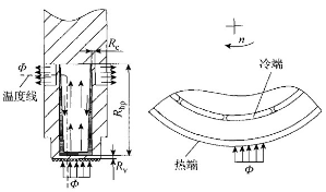 熱管金剛石干磨片在傳熱方向.上的熱阻主要包括:熱端熱阻R.;冷端熱阻R.;內(nèi)部環(huán)形熱管熱阻Rp.金剛石干磨片熱,冷端熱阻取決于金剛石干磨片基體自身材料屬性,且大小與壁厚成正比.在金剛石干磨片結(jié)構(gòu)固定的前提下,金剛石干磨片內(nèi)部環(huán)形熱管熱阻主要受內(nèi)部氣/液兩相轉(zhuǎn)變過程影響,根據(jù)旋轉(zhuǎn)熱管的工作特性.熱端熱流輸入強(qiáng)度、冷端散熱條件、金剛石干磨片旋轉(zhuǎn)姿態(tài)與轉(zhuǎn)速、工質(zhì)屬性及工質(zhì)形成液膜厚度等因素都能引起該部分熱阻發(fā)生改變.可見,熱管金剛石干磨片的等效熱阻主要取決于內(nèi)部環(huán)形熱管的熱阻.