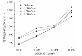 5%充液率下的熱管金剛石水磨片等效傳熱系數(shù)與燕發(fā)端熱流密度之間的關(guān)系如圖所示,在所有轉(zhuǎn)速條件下,熱管金剛石水磨片內(nèi)環(huán)形熱管的等效換熱系數(shù)都是隨著熱流密度增加而增加,主要是由于隨著熱流密度的增加,環(huán)形熱管內(nèi)部傳熱方式由表面蒸發(fā)轉(zhuǎn)變成核態(tài)沸騰,提高了傳熱效率,從而提高了環(huán)彤熱管傳熱系數(shù)。但是如果熱流密度持續(xù)增加,環(huán)形熱管內(nèi)部傳熱方式會(huì)由核態(tài)沸騰變成膜態(tài)沸騰,使熱管失效。本試驗(yàn)中最大熱流密度為15 000 W/m’,并沒有出現(xiàn)熱管失效的現(xiàn)象,可見熱管金剛石水磨片的失效條件幾乎很難達(dá)到。